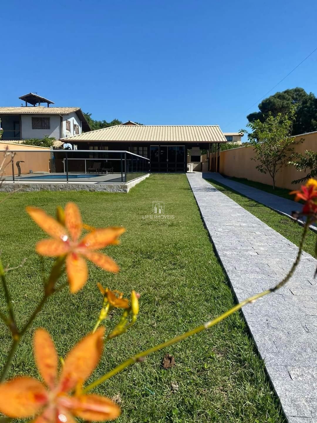 Área de Lazer Completa: A casa conta com uma área de churrasqueira coberta, perfeita para momentos em família e confraternizações, além de uma piscina com deck e espaço para espreguiçadeiras.