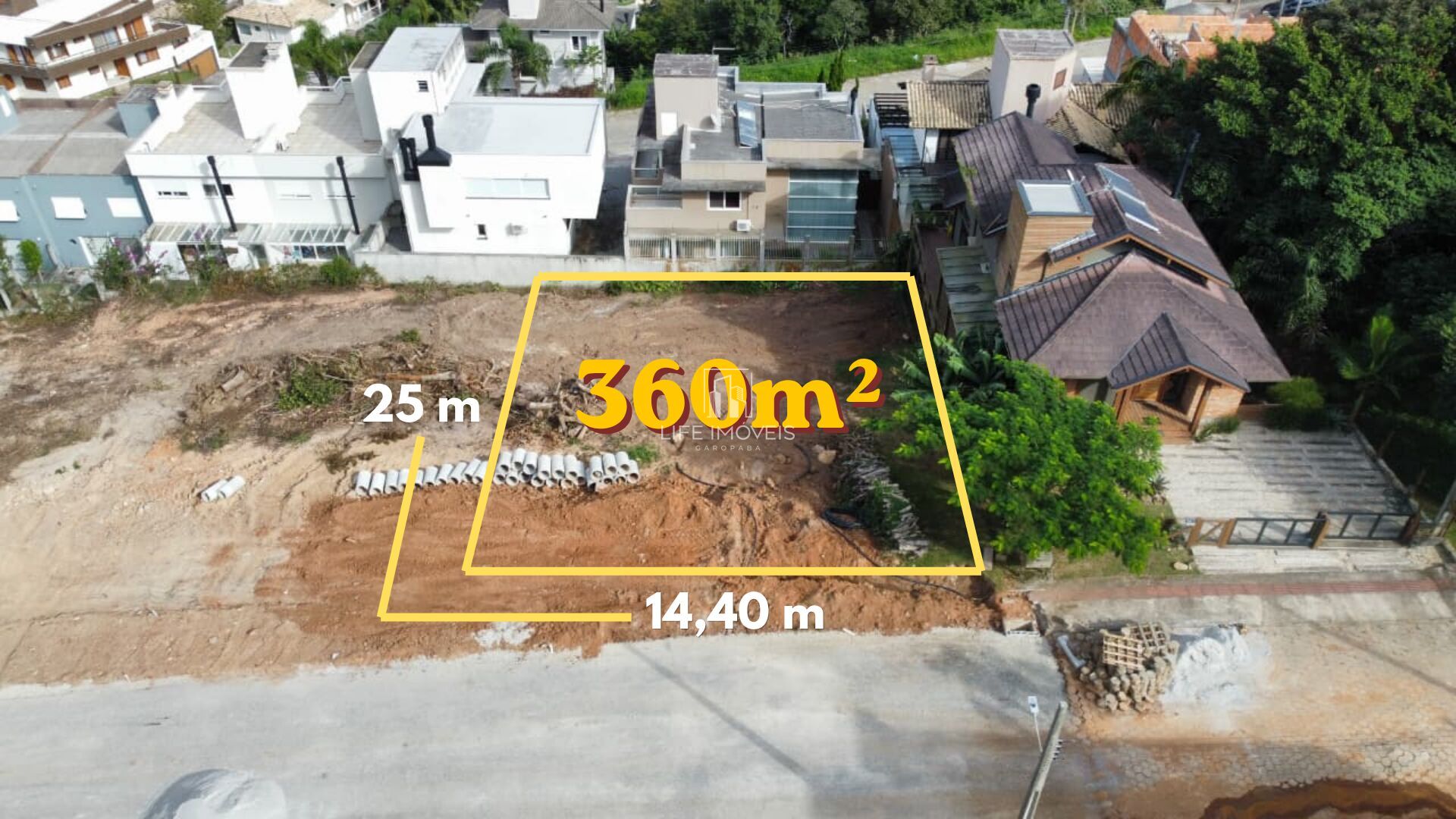 Com topografia plana, o lote possui 14,40 metros de frente por 25 metros de profundidade, totalizando um espaço ideal para desenvolver um projeto residencial moderno e funcional.